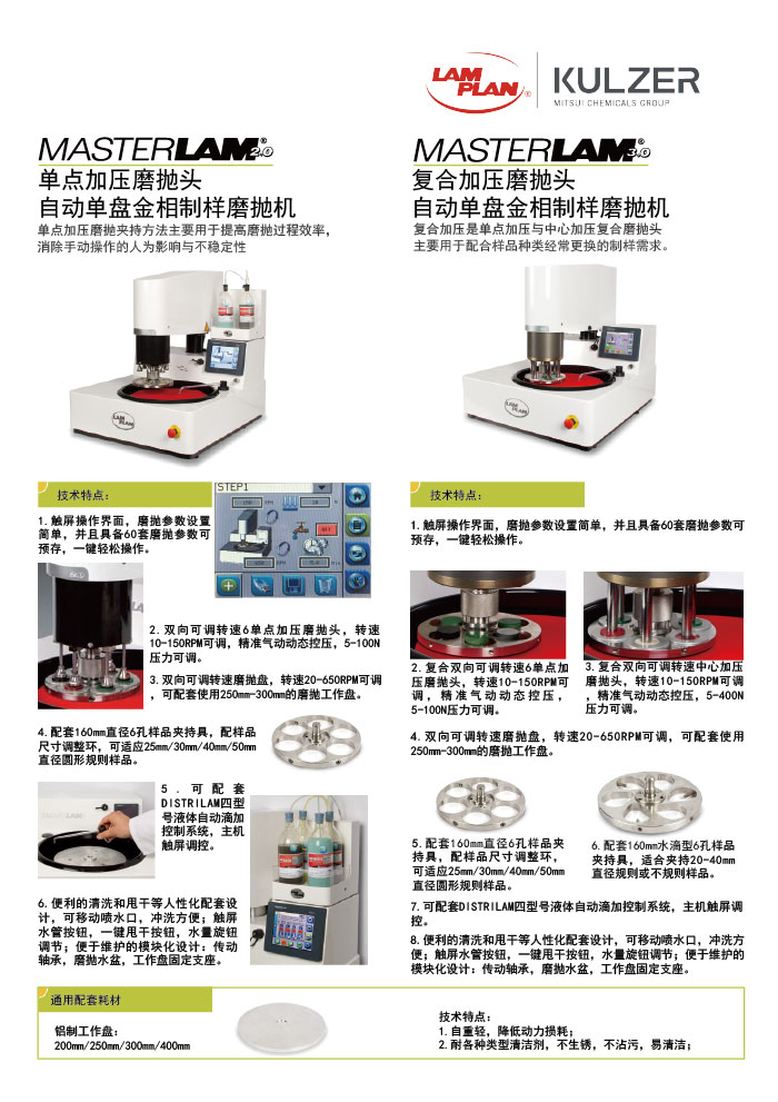 | 樣品夾持與磨拋能力 | 3個或者4個或者6個對稱式夾持中心加壓最大??40?mm尺寸樣品 可磨拋1個到6個尺寸從25.4mm/30mm/40mm/50mm直徑的樣品 |
