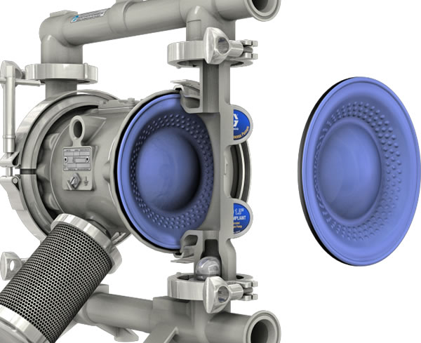 在衛(wèi)生領(lǐng)域應(yīng)用中,被泵送的介質(zhì)通常都含有懸浮的小顆粒。在這種情況下,許多用戶都會選用PTFE/EPDM一體式膜片,其接觸物料一側(cè)的材質(zhì)是聚四氟乙烯(PTFE),接觸壓縮空氣一側(cè)的材質(zhì)是三元乙丙橡膠(EPDM)。一體式膜片可阻止任何介質(zhì)滲入膜片壓板背面,從而不會滋生細菌。