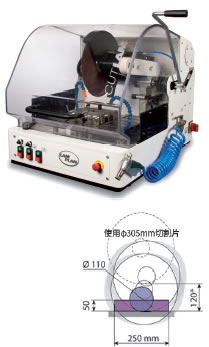 | 建議使用直徑250-300mm切割片 可用于切割尺寸小于φ 110mm圓形或50mm×210mm矩形的樣品 |